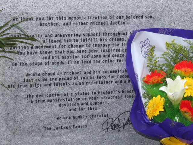 The base of the statue is inscribed with the dedication “Michael Jackson. All for Love” and also bears a message of gratitude from the Jackson family written by Randy Jackson on behalf of Michael’s parents, siblings and children.